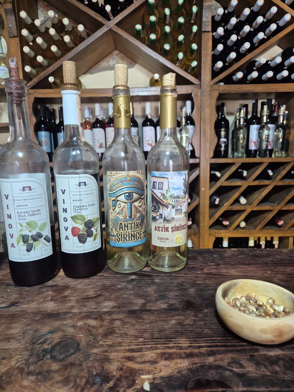 떠나는 날 시간 여유가 있어 셀주크에서 버스로 다녀올 수 있는 쉬린제를 다녀왔어요.(숙소 사장님께서 버스정류장 알려주셨고 작은 미니버스 같이 생겼는데 돌무쉬라고 하더라구요) 고즈넉한 풍경이 펼쳐지는 이곳은 와인이 유명한 곳이라고 하더라구요.  저 와인 잘 모릅니다. 단 거를 너무 좋아하는데 와인을 마실 때마다 떫은 맛이 강해서 좋아하지 않는데.... 쉬린제  이곳 그런 제가 와인을 3병이나 사게 만든 곳이에요. 저희를 보자마자 '안녕하세요 와인 먹고 가세요' 하신 가게에 들어가서 시음 했는데 한국말은 왜 이렇게 잘하시는지ㅋㅋㅋㅋ '오디와인, 머루와인, 체리와인, 블루베리와인, 석류와인' 거의 랩처럼 이야기하셔서 놀랐어요ㅋㅋㅋㅋ 오디와인, 머루와인 시음해보고 표정이 애매하자 사장님께서 어떤 와인 좋아해요? 단 거?라고 물어보셔서 고개를 끄덕이자 어떤 와인(세 번째 특이한 그림 그려져있는 와인도 맛있었는데 결론적으론 다른 와인을 사서 무슨 맛이었는지 기억이 안나요...ㅠ)과 메론와인을 맛보게해주셧는데 네... 사버렸습니다 메론와인ㅋㅋㅋㅋㅋ 와인에서 이런 맛있는 과일 맛이 날 수 있는지 처음 알았어요.(지금 집에 고이 모셔져 있습니다 한국에선 아무리 검색해도 안 나와서 남편이랑 아껴먹기로 했어요ㅋㅋㅋ) 그렇게 복숭아와인, 메론와인, 수박리큐르를 사서 왔습니다ㅋㅋㅋㅋㅋ