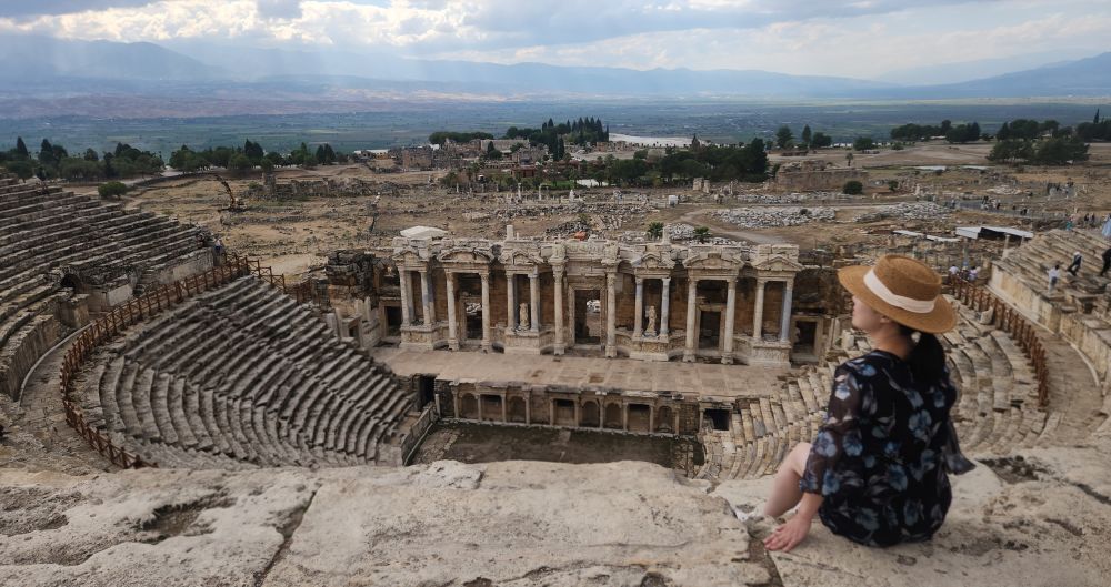 2. 괴뢰메에서 야간버스(10시간소요)를 타고  목화성 파묵칼레에 도착했습니다(1박2일 일정). 아침에 도착한터라 피곤했지만 유네스코세계유산을 언제보겠나 싶어 파묵칼레를 향했습니다. 다행이 블루여행사에서 잡아준 호텔이 파묵칼레 마을입구에서 가까운 곳이라 도보로 금방도착했습니다. 입장료가 비쌌지만(튀르키예 왠만한 유적지등 입장료가 2인 기준 대략10만원) 히에라폴리스, 극장 등 포함된비용으로 눈도장 많이 찍고 왔어요.